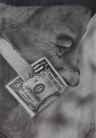 Die Macht des Geldes von Puja Agarwal Dieses Bild repräsentiert die heutige Situation in der Welt meiner Meinung nach. Viele Menschen kann man davon abhalten, ihre Meinung zu sagen, wenn man Geld anbietet. Die einflussreichsten Menschen haben so die Macht über Millionen von Menschen und das eigentlich nur mit einem Papierfetzen. Leute, die sich dagegen wehren, werden oft von der Gesellschaft verstossen oder es wird ihnen etwas angetan. Leider ist es so weit gekommen, dass Geld heute so eine Macht hat, dass es unser Leben komplett beeinflussen kann. Das Bild zeigt ganz einfach, dass der Mann nicht sprechen kann, weil er einen Geldschein vor seinem Mund kleben hat. Man könnte auch interpretieren, dass ihm dies aufgezwungen wurde, da das Klebeband ein Signal von Gewalt sein könnte. Auf beide Weisen ist es so, dass der Mann nicht sprechen kann, ob ihm das jetzt aufgezwungen wurde oder es freiwillig gemacht hat. Die Parallele kann man im Fussball gut sehen. Vor allem im Männerfussball wird viel verheimlicht und hinter, wie auch vor, den Kulissen läuft Geld am Laufmeter. Korruption ist ein grosses Thema, was ich auch mit diesem Bild verbinde. Deshalb diente es mir auch als Inspiration für das freie Projekt.