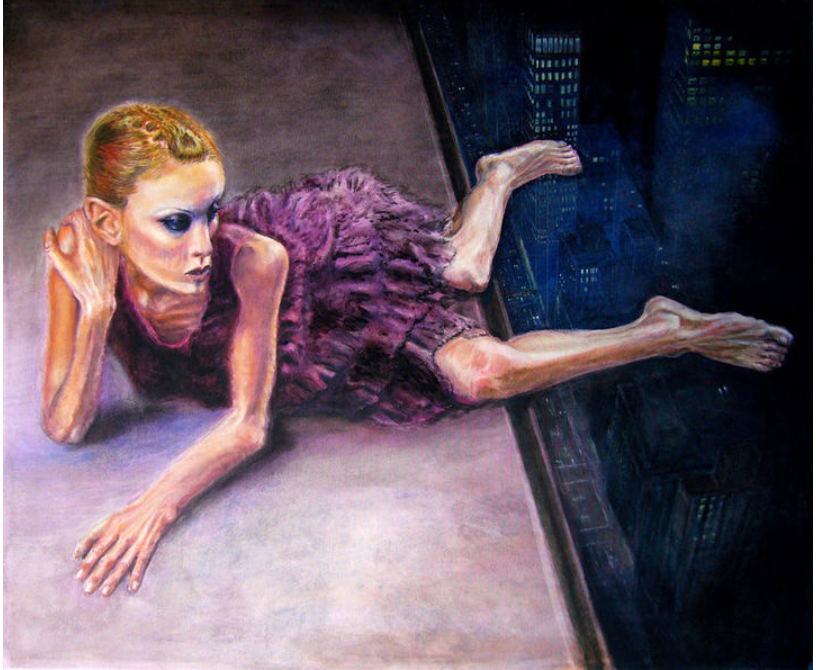 Dieses Kunstwerkt wurde von Christian Ose gemalt. Er hat es mit Öl auf Nessel gemacht und mit der sogenannten Pinseltechnik. Das Bild zeigt eine junge Frau, die auf einem Hochhausdach am Abgrund steht. In meinen Augen steht dieser Abgrund als Symbol für den Tod. Die Frau ist offensichtlich schwer krank und leidet an Magersucht (erkennt man an den Knochen). Wenn sie nicht gegen die Krankheit antritt, fällt sie runter. Es zeigt also wie Anorexie große Macht über das Leben des Betroffenen einnimmt. Wenn man nicht dagegen ankämpft kann es dich zum Abgrund also in den Tod führen.