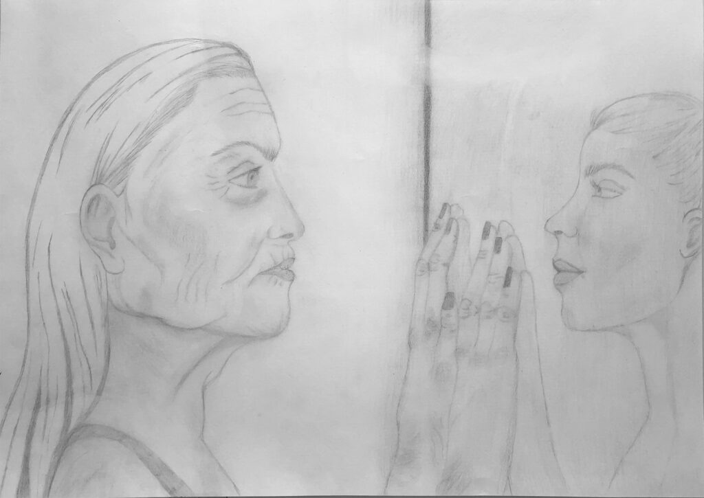 Das Ziel meines Projekts war es, die Macht der Zeit auf das menschliche Aussehen bildnerisch darzustellen. So habe ich mich für eine Gegenüberstellung von einer alten Frau zu einer jungen Frau entschieden. Durch die direkte Konfrontation des Spiegelbildes, wollte ich spezifisch auf das veränderliche Aussehen eingehen. Die Berührung der Hand an dem Spiegel verdeutlicht die eigentliche Nähe und Verbindung zwischen den Personen, da sie im Inneren die ein und selbe Person sind. Die jetzige ältere Frau sieht in ihrem Spiegelbild ihr früheres bzw. junges Ich. Nur die Zeit macht die beiden Frauen zu einer optisch anderen Person.
