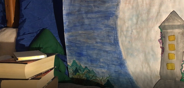 Ich habe eine Decke und ein grosses Stoffstück (einst Teil eines Vorhangs) verwendet, um das gesamte Bett damit einzuhüllen. Das Bild habe ich an der Rückwand aufgehängt. Leider habe ich aber die Wand grösser eingeschätzt, weshalb man vom Bild in aufgehängter Form, den unteren Teil mit dem Wald nicht erkennen kann. Dennoch wirkt es in meinen Augen sehr gut und erfüllt den Zweck vollkommen. So ist es mir gelungen den inneren Raum abzudunkeln. Die Lampe, die den Innenraum beleuchtet, lässt den Raum von aussen sehr magisch wirken und erlaubt es im Innenraum zu lesen.