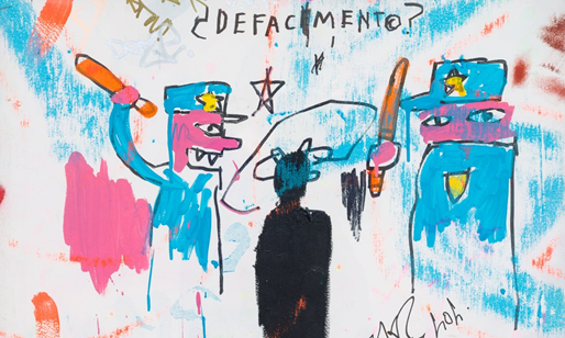 Das Gemälde wurde von Jean-Michel Basquiat gezeichnet. Es zeigt zwei Polizisten die eine gesichtslose, schwarze Figur schlagen, die Michael Steward darstellt. Die Hintergrundgeschichte ist, dass Steward eine weisse Frau auf die Wange küsste. Dies provozierte die Polizisten, die an seinem Tod beteiligt waren. Die Gesichtslosigkeit der schwarzen Person untermauert den Kommentar Basquiats zu Stewards Tod. Es hätte er oder jeder andere afroamerikanische Mann sein können. Ich habe dieses Bild gewählt, weil es, wie bei meinem eine verzerrte Machtdynamik (der Polizei) und die Realität aufzeigen. Das Bild zeigt auch die Realität des schwarzen Mannes in Amerika, der in einem Land lebt, in dem auf Grund seiner Rasse weniger Macht erhält, als der weissen Mann, der ihn sogar töten könnte.
