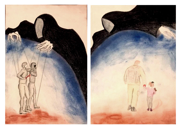 Die dunkle Gestalt, die über allem steht und auf dem ersten Bild die beiden Figuren lenkt, soll die Leute darstellen, die niemand kennt, und alles aus der Ferne leitend die sich aber nie die Hände schmutzig machen. Die rote rechte Hand, die der Soldat hat, soll die ganzen schrecken darstellen, die die Soldaten mit nach Hause zu ihren Kindern bringen z.B. in der Form von Kriegsverletzungen oder posttraumatischen Belastungsstörungen.