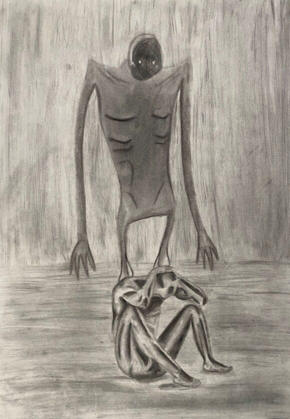 Ich habe zuerst recherchiert. Ich schaute im Internet nach, was eine Depression einer Person antut und was eine Depression ausmacht. Ich wusste schon vieles aus eigener Erfahrung. Danach suchte ich mir Inspiration von Bildern, in welchen andere Künstler versucht haben darzustellen, wie sich Depressionen anfühlen. Ich habe sehr viele großartige Bilder gefunden, die mir auch helfen konnten. Als ich dann wusste, wie mein Bild ungefähr aussehen sollte, fing ich mit der Skizze an. Sobald ich die Skizze hatte, konnte ich dann mit meiner Schlusszeichnung beginnen. Ich habe mit Kohle gezeichnet, da eine Depression für mich keine Farbe hat und man kann auch gut mit Kohle arbeiten. Ich habe zuerst die Umrisse meines Bildes auf das A2 Blatt skizziert und erst danach habe ich mit der Kohle angefangen.