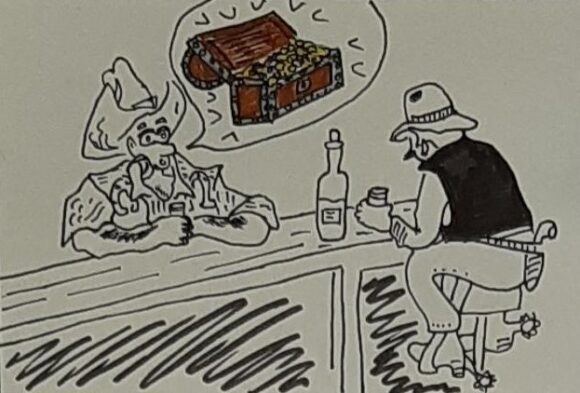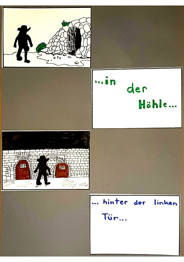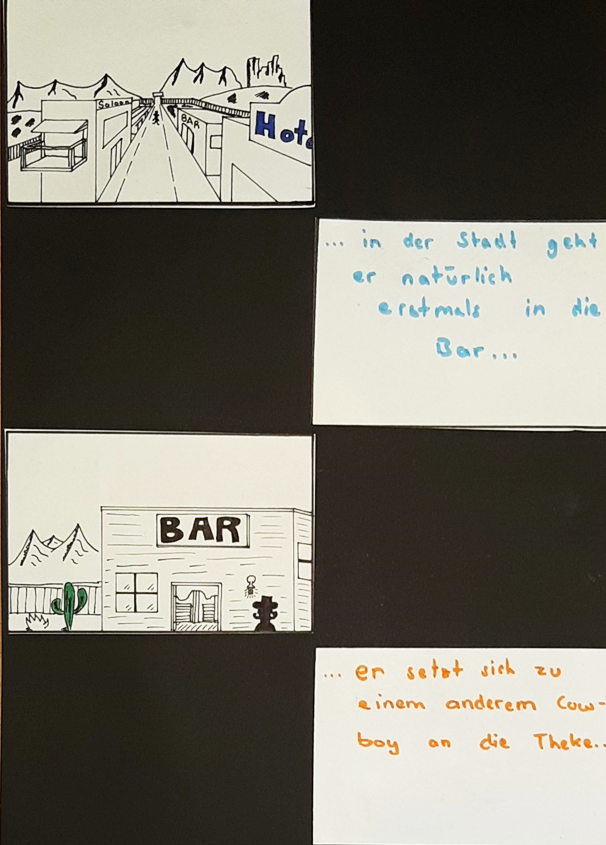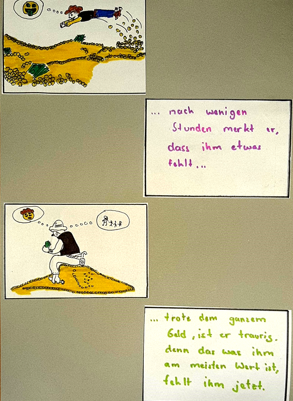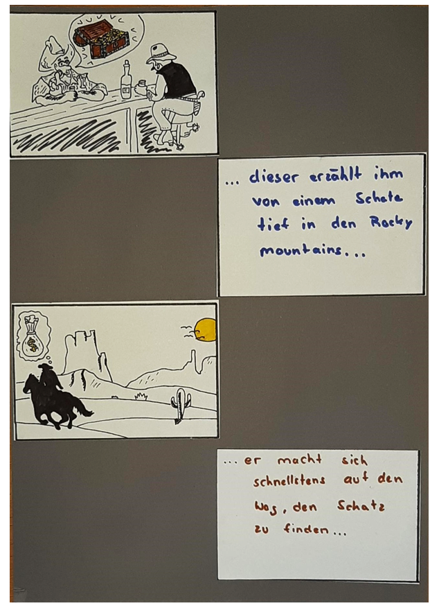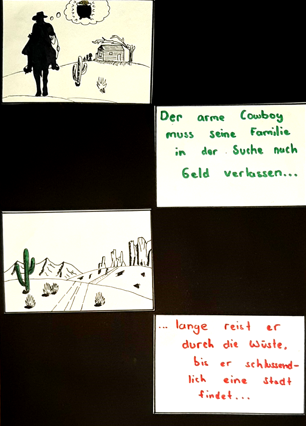Meine Arbeit sollte den Leser/ Leserin zum Denken anregen. Sie sollten sich überlegen, was eigentlich einen Wert hat. Geld hat eine enorme Macht, denn man kann daraus fast alles kaufen. Doch Gefühle, Familie und Erinnerungen, haben Wert auf einer ganz anderen Ebene. Ein Millionär kann vielleicht alles kaufen was ihm gefällt, aber ein einfacher Mann mit einer Familie ist vielleicht trotzdem glücklicher. Genau um diese Tatsache geht es in meinem Comic. Ein armer Cowboy verlässt seine Familie in der Suche nach Reichtum. Schlussendlich muss er sich zwischen zwei Türen entscheiden. Die eine bringt ihn zurück zu seiner Familie und die andere Tür gibt ihm den Reichtum, den er sich gewünscht hat. Trotz seiner Reichtümer merkt er schlussendlich was ihm genau am wertvollsten ist, seine Familie. Der nachfolgende Comic sollte hierbei als Illustration dienen.