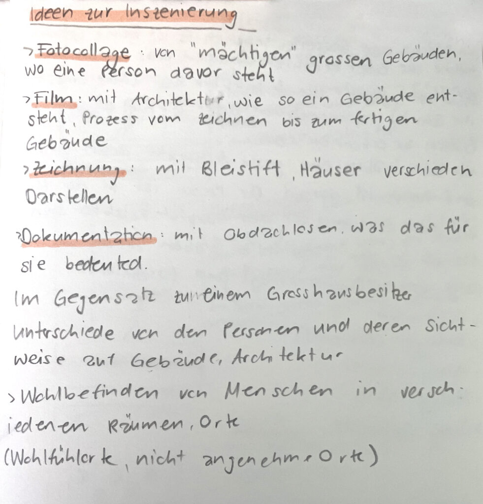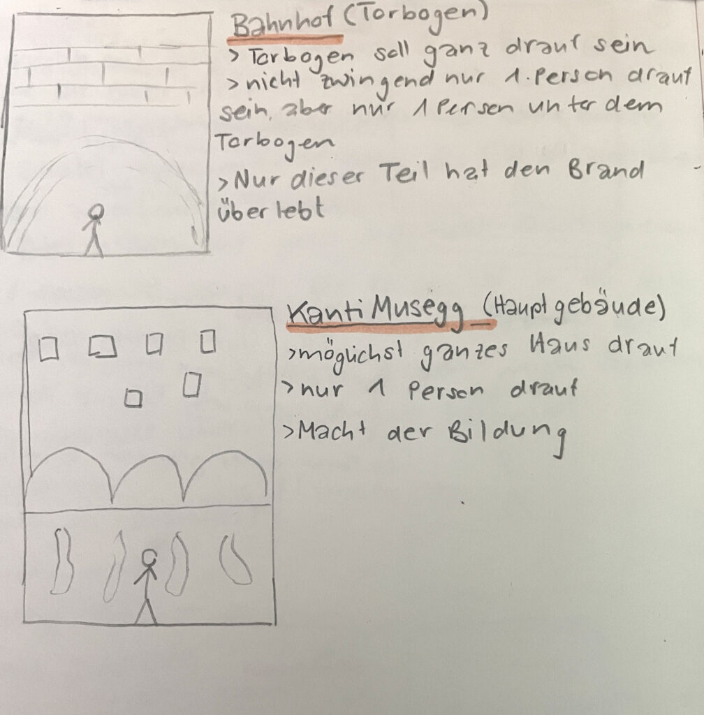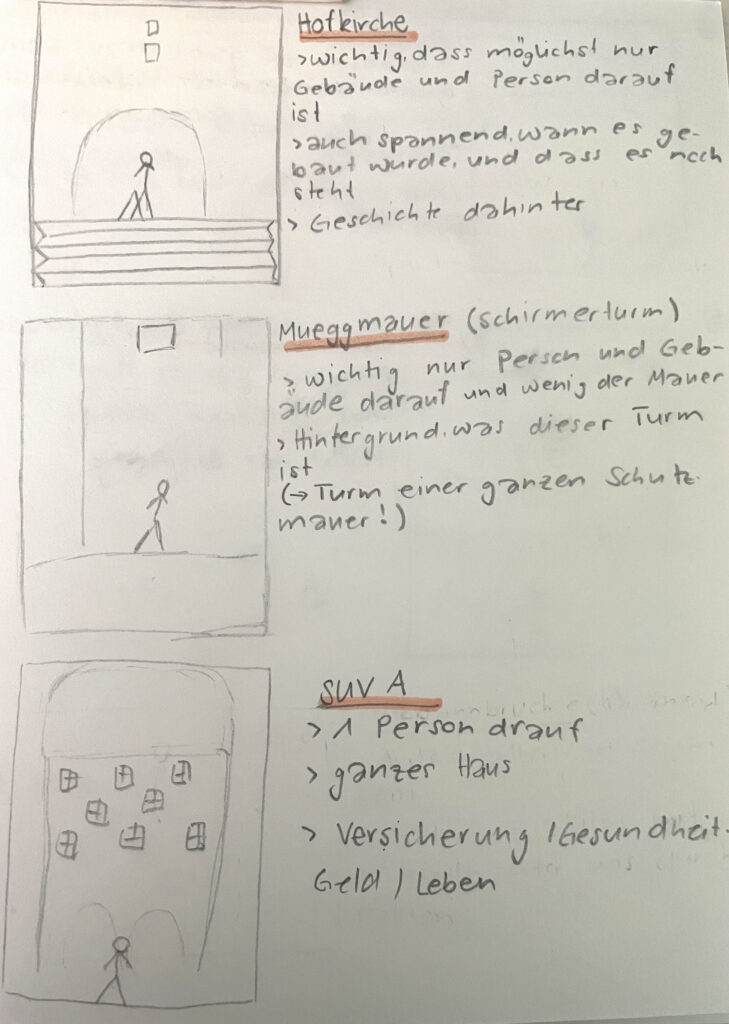 Ich habe mir lange überlegt, was ich machen will. Mir gefielen verschiedene Themengebiete daher konnte ich mir auch verschiedene Themen vorstellen. Von Natur (-katastrophe) bis zur Macht vom Körper oder Ohnmacht im Bereich Sport. Das Themengebiet Architektur fand ich dann am spannendsten. Nun musste ich entscheiden, wie ich arbeiten will. Ideen von mir waren zeichnen, filmen, malen und fotografieren. Weil mich Fotografie sehr interessiert fand ich, dass dies der perfekte Rahmen ist, dies einmal auszuprobieren. Da ich noch nie richtig fotografiert habe, habe ich mir eine ziemlich grossen Herausforderung gestellt. Als ich im Internet recherchierte fand ich den Fotografen Iwan Baan, welcher mich dazu inspirierte, die Macht der Architektur auf den Menschen darzustellen. Er selbst hat seinen Fokus darauf verengte, die verschiedenen Arten festzuhalten, wie Individuen, Gemeinschaften und Gesellschaften ihre gebaute Umwelt erschaffen und mit ihr interagieren. Ich wollte eine Simple Inszenierung für mein Projekt. Also habe ich vor Gebäude, welche Macht durch ihre Grösse repräsentieren sie jedoch auch immer mindestens eine zweite Macht ausstrahlen, eine Person gestellt. Mir war es wichtig, dass die Person möglichst in der Mitte steht, da sie der Protagonist in meinen Fotos ist.