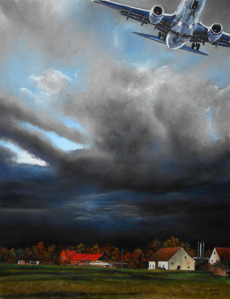 Ich habe dieses Bild ausgesucht, da ich in diesem Bild die Verbindung zwischen Mensch und Natur wiedersehe. Denn das Flugzeug, welches vom Menschen gemacht wurde, gibt viele Schadstoffe in die Umwelt ab. Durch dies Verschlechtert sich die Umwelt. Dies sehe ich im Bild anhand der dunklen Wolken hinter dem Flugzeug. Doch das Leben auf dem Boden sieht sehr umweltfreundlich aus, keine Fabriken, Kernkraftwerke… Da sehe ich den Zusammenhang mit dem teils Blauem Himmel. Ich finde dieses Bild ist sehr schön gezeichnet und ich kann eine klare Verbindung zwischen Mensch und Natur feststellen.